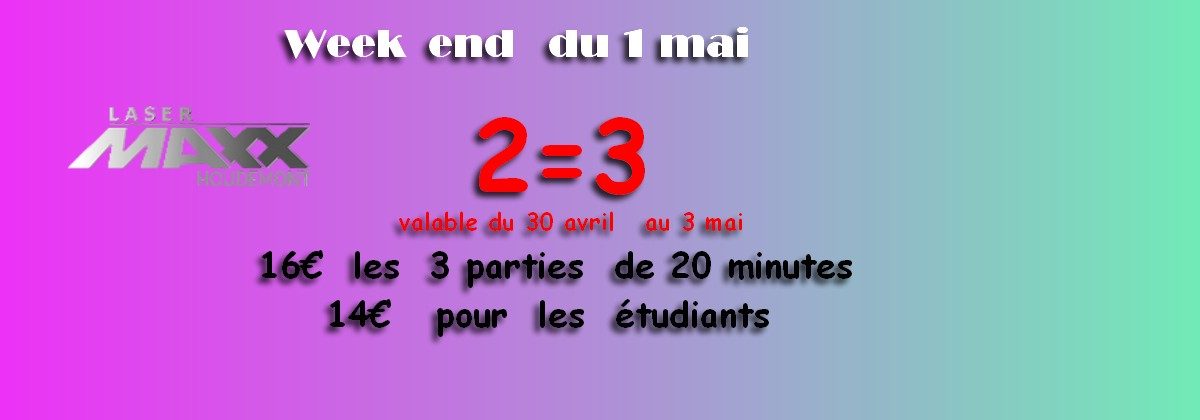 ssPour le week end du 1 mai , votre centre vous propose l’offre suivante : 2 partie de laser achetée = la 3° est offerte .